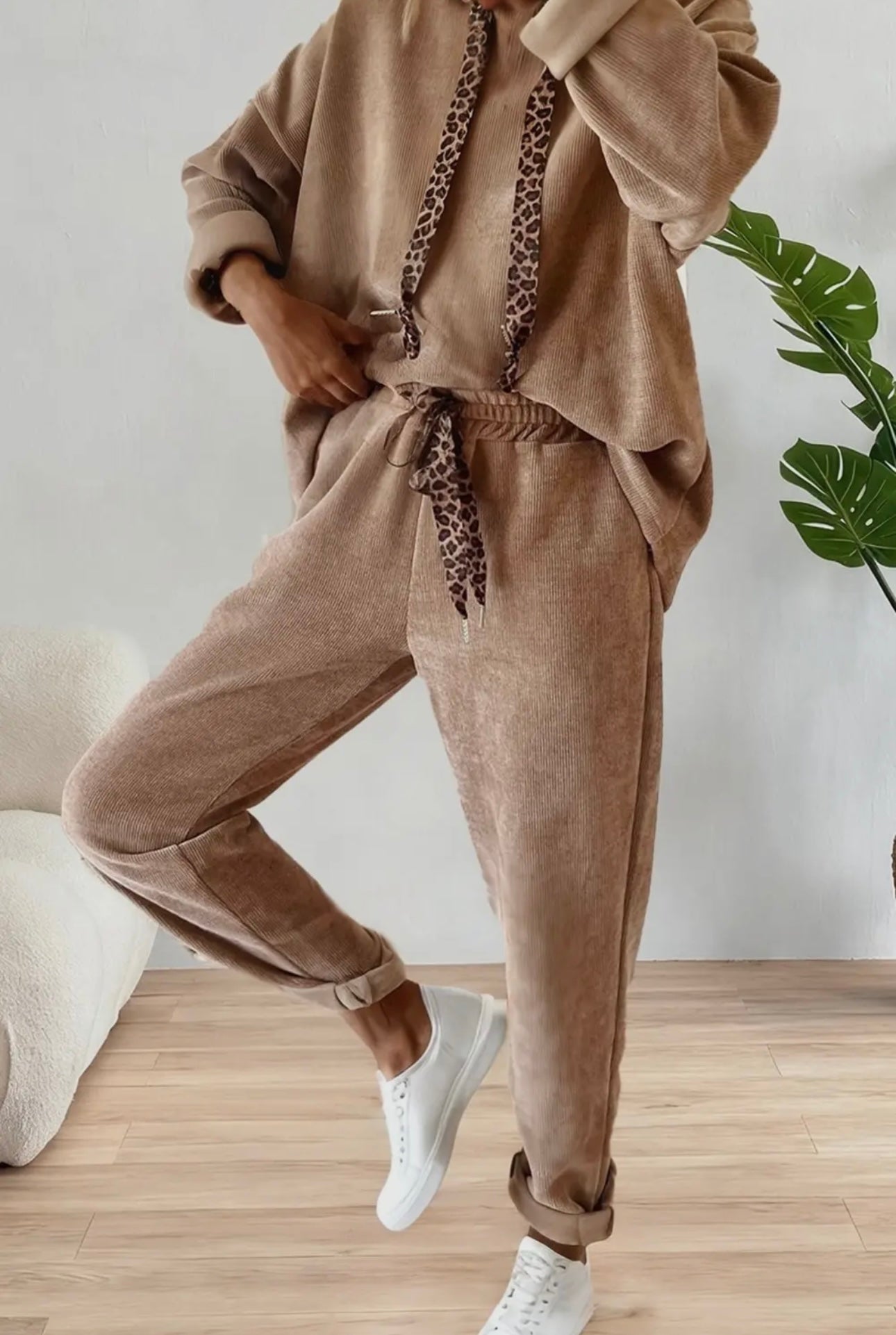 Dark Khaki Drawstring Pullover Hoodie and High Waist Corduroy Pant Set